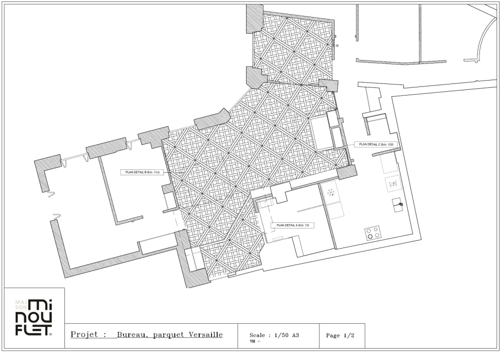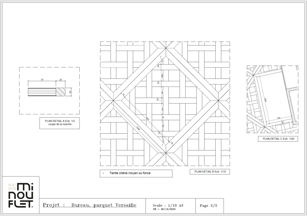 Un relevé précis des dimensions est réalisé afin d’établir un calepinage détaillé du parquet. Cette étude permet de définir l’implantation des panneaux, leur orientation et l’équilibre général du motif dans la pièce.
