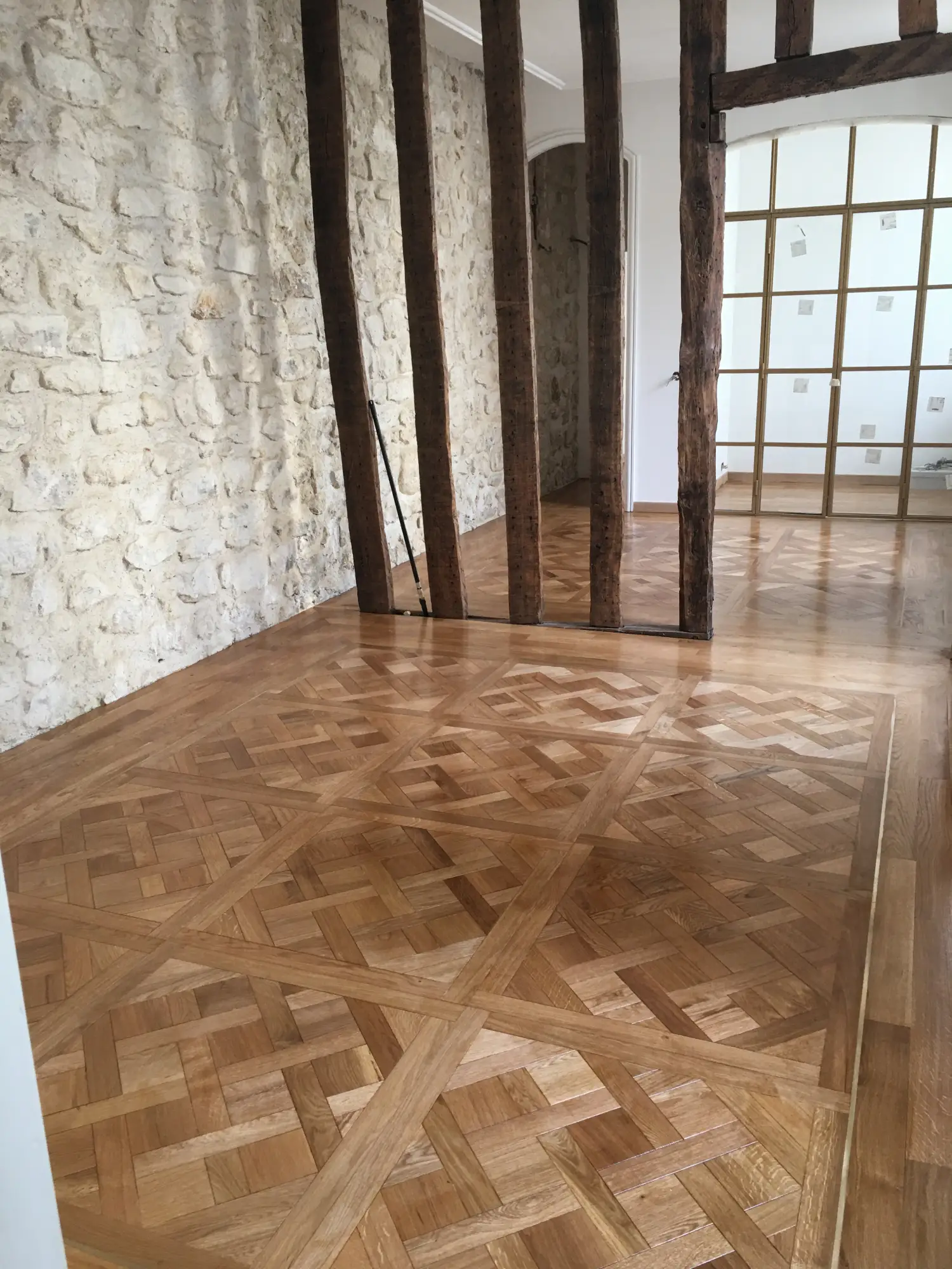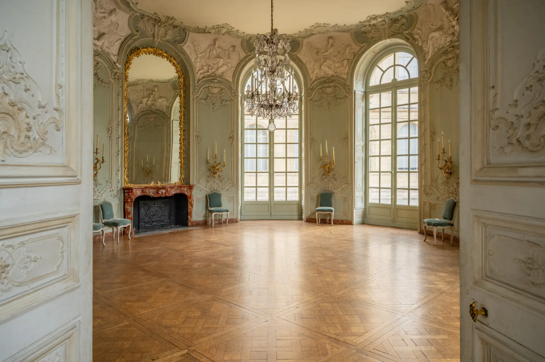 Des dessins géométriques peuvent en varier l’aspect, tel le parquet de l’hémicycle de la Salle du Conseil à Fontainebleau, orné d’une étoile par Gabriel. En général, les parquets cirés et miroitants restent nus, sans tapis. Ils sont entretenus par les indispensables frotteurs.
