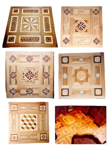 Ces parquets peuvent aussi comporter une marqueterie massive (appelés alors parquet de marqueterie ou parquet en mosaïque) composé de motifs en étoile, par exemple, comme au château de Maisons. Dans ce même château il subsiste un parquet de marqueterie de bois de rapport, dans le cabinet des Miroirs.